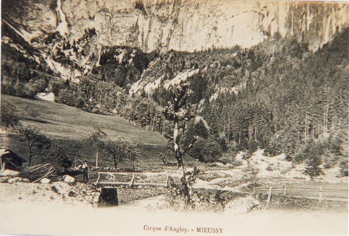 Carte postale, noir et blanc, montrant le cirque d'Angley à Mieussy.