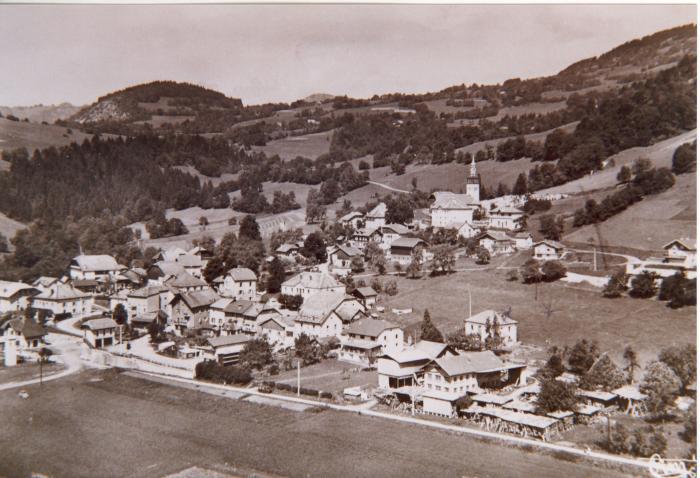 Carte postale ancienne, noir et blanc, montrant une vue générale de Mieussy. On distingue l'église.