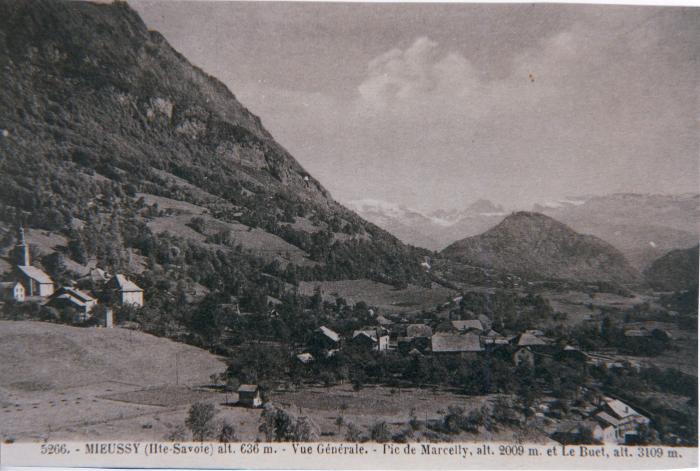 Carte postale ancienne, noir et blanc, montrant une vue générale de Mieussy. On distingue l'église. En arrière-plan, on voit le Buet et le pic de Marcelly.