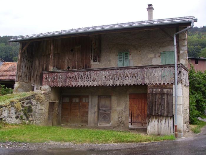 Photographie, en couleurs, représentant une ancienne maison sur la commune de Mieussy. Il s'agit d'une maison avec un balcon ouvragé en bois. Le style de ce balcon semble être une alternance de coeur à l'endroit et de coeur à l'envers. Cette forme de palines est relativement ancienne : début du 19ème siècle.