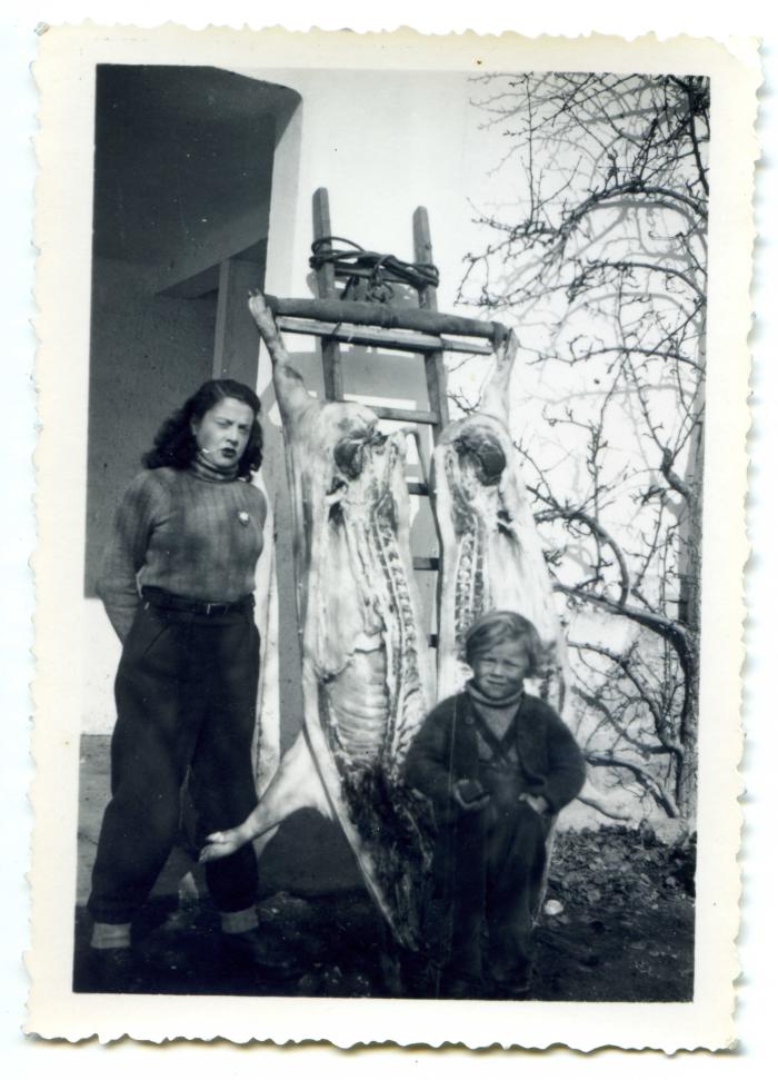 Photographie en noir et blanc après la mise à mort du cochon. La viande est prête à être travaillée. Le cliché daterait de 1945.
