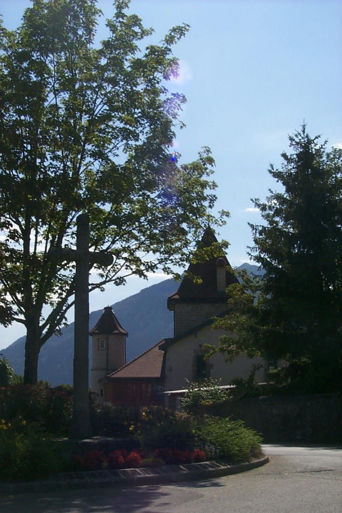Photographie en couleurs représentant une croix en pierre ainsi que le Château Warchex, ancienne maison Bastian, dans le village de Peillonnex.