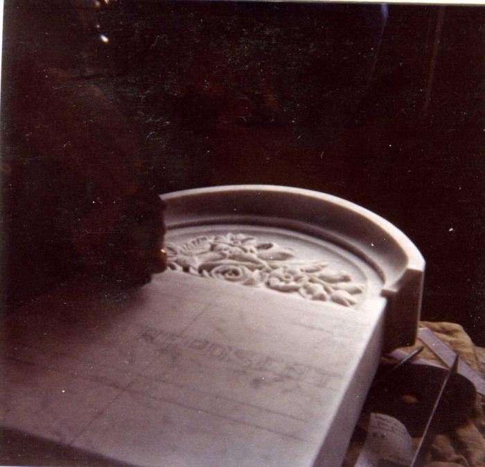 Photographie couleur représentant Monsieur Gandi, marbrier, gravant une plaque de marbre. (Saint-Julien-en-Genevois).