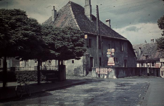 Cette photographie couleur représente une vieille maison de Saint-Julien-en Genevois. La place que l'on devine sur sa droite est celle de la Poste. Aujourd'hui la bâtisse a été démolie. Sur le muret délimitant la propriété, une inscription publicitaire indiquant : « photo tsf ». Au même niveau, un poteau métallique avec plusieurs enseignes.