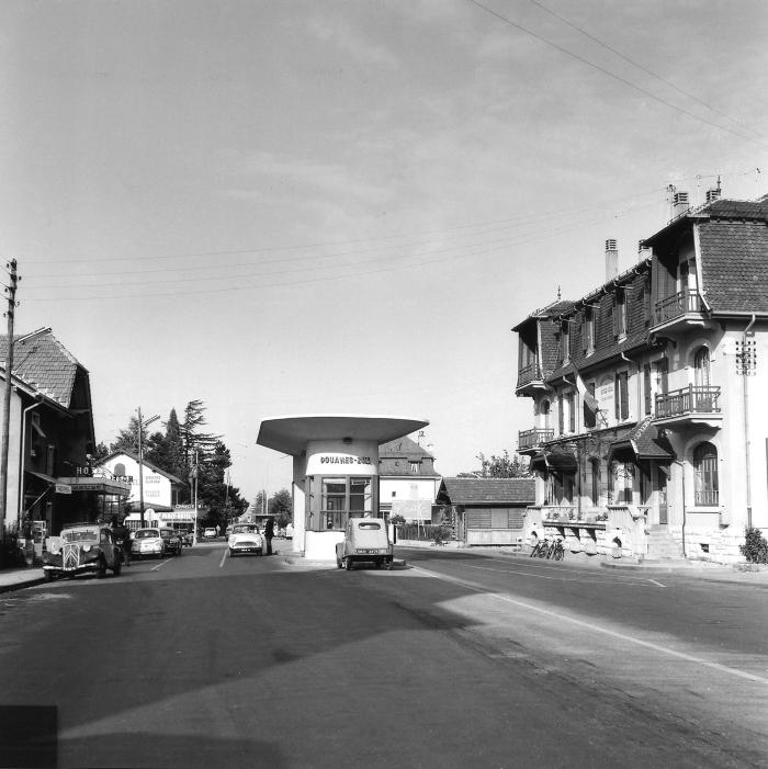 Photographie en noir et blanc de la douane de Perly, près de Saint-Julien-en-Genevois. A droite du bâtiment des douanes, une petite maison : le bureau de change.