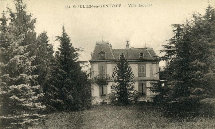 Cette carte postale sépia représente la villa ESCOFIER à Saint-Julien-en-Genevois. C'est une maison de maître entourée d'un parc boisé.