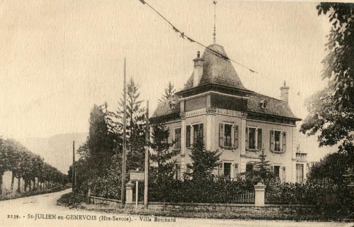 Cette carte postale sépia représente la villa BONNARD à Saint-Julien-en-Genevois. C'est une maison de maître