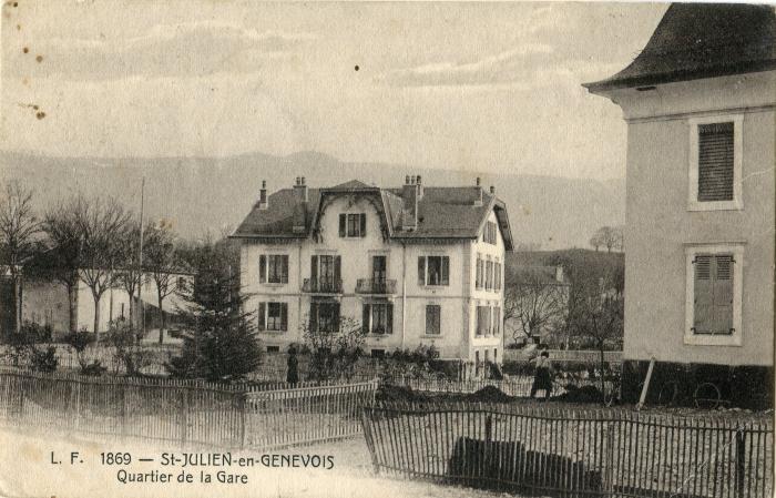 Cette carte postale sépia représente un immeuble dans le quartier de la gare à Saint-Julien-en-Genevois