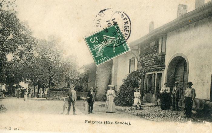 Carte postale sépia représentant un café restaurant à Feigères au début du XXème siècle.