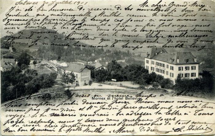 Carte postale en noir et blanc, représentant le village de Mornex et l'hôtel Bellevue.