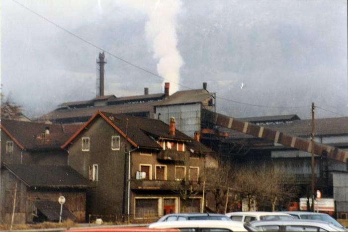 Photographie en couleur de l'usine du Giffre depuis l'entrée coté Saint-Jeoire, en direction du four rotatif.
