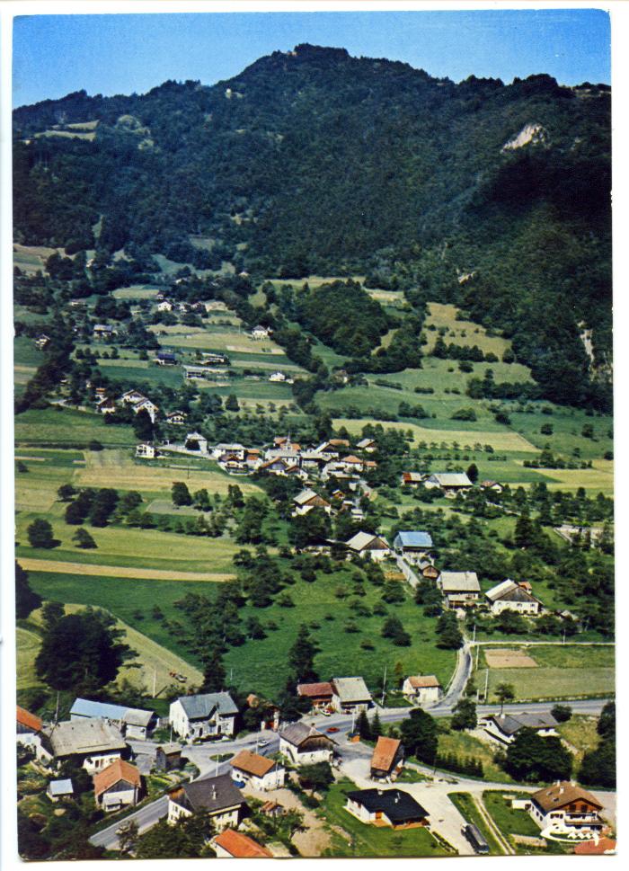 Carte postale en couleur représentant une vue générale du village de Ville-en-Sallaz. Cette image date des années 1970.