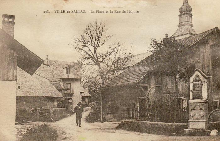 Cette carte postale représente le clocher de Ville-en-Sallaz, en 1920. Celui-ci a été redessiné. Il est visible en arrière-plan. On peut apercevoir la place et la rue de l'église.