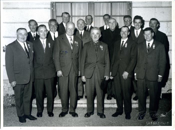 Cette photographie représente la remise de médaille du conseil municipal de Ville-en-Sallaz en 1977.