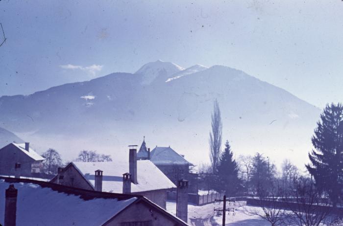 Photographie en couleur représentant le chef-lieu de Viuz-en-Sallaz en hiver avec le Môle.