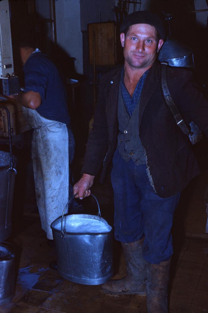 Photographie en couleur représentant le dépôt de lait à la fruitière de Viuz-en-Sallaz par les sociétaires.