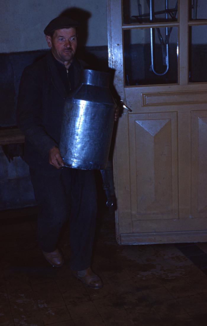 Photographie en couleur représentant le dépôt de lait à la fruitière de Viuz-en-Sallaz par les sociétaires.