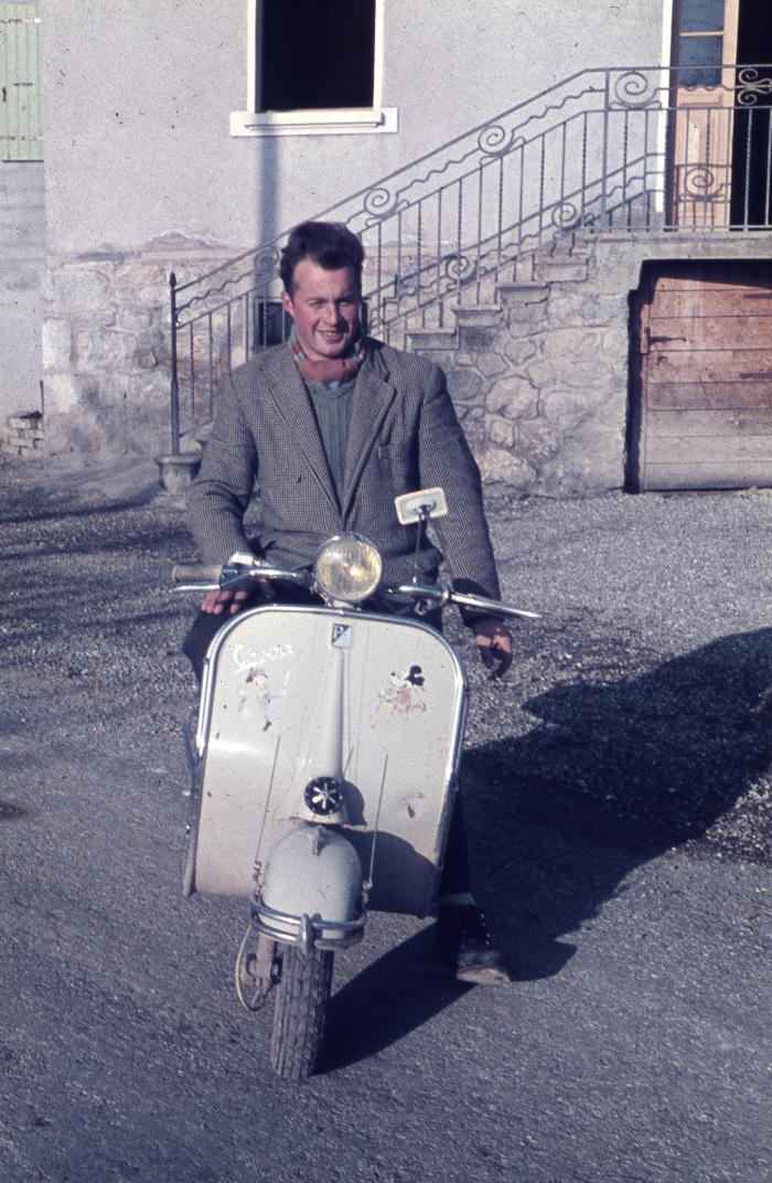 Photographie en couleur représentant le transport du lait à la fruitière de Viuz-en-Sallaz. Il s'agirait de Jean Pellet-Lange