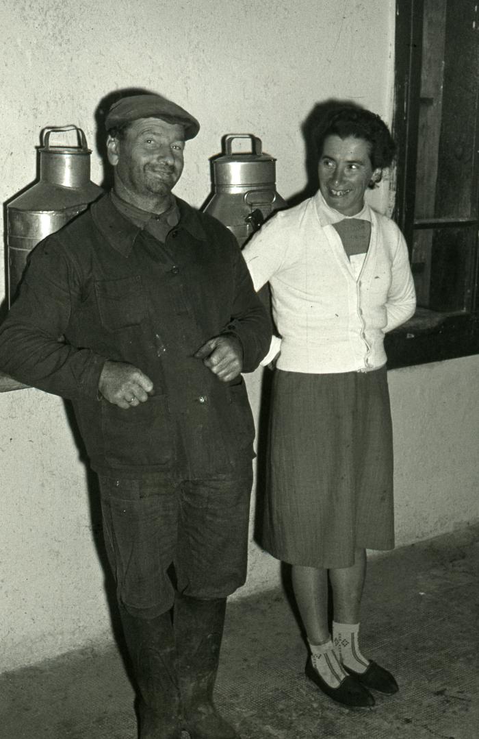 Photographie en noir et blanc représentant le dépôt de lait à la fruitière de Viuz-en-Sallaz par les sociétaires (Irène DUCHOSAL et Marcel MEURIER)