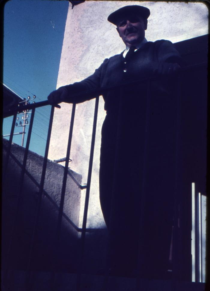 Photographie en couleur représentant une personne debout sur les marches de la fruitière de Viuz-en-Sallaz.
