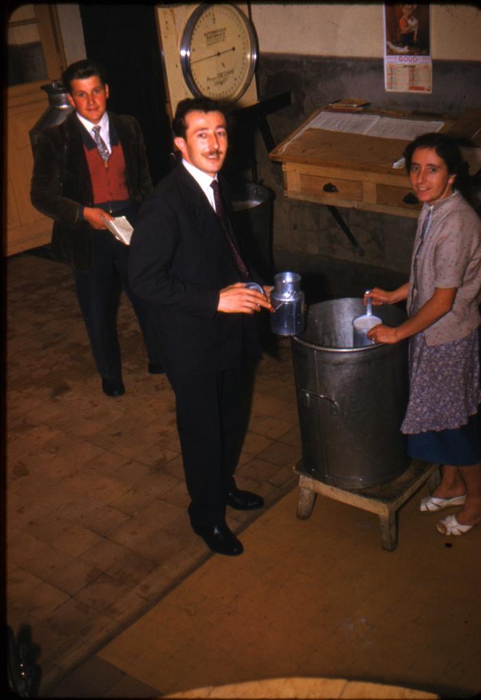Photographie en couleur représentant une dégustation de lait de la fruitière de Viuz-en-Sallaz. A droite du cliché figure la maman de Mme KÜFFER, et au premier plan avec la moustache Eddo FUESS, propriétaire de la fruitière.