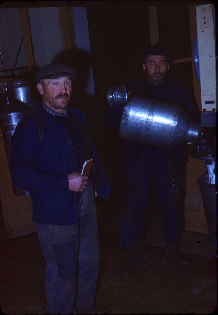 Photographie en couleur représentant le dépôt de lait à la fruitière de Viuz-en-Sallaz par les sociétaires (Jean Piccot Ladret et Fernand Mercier)