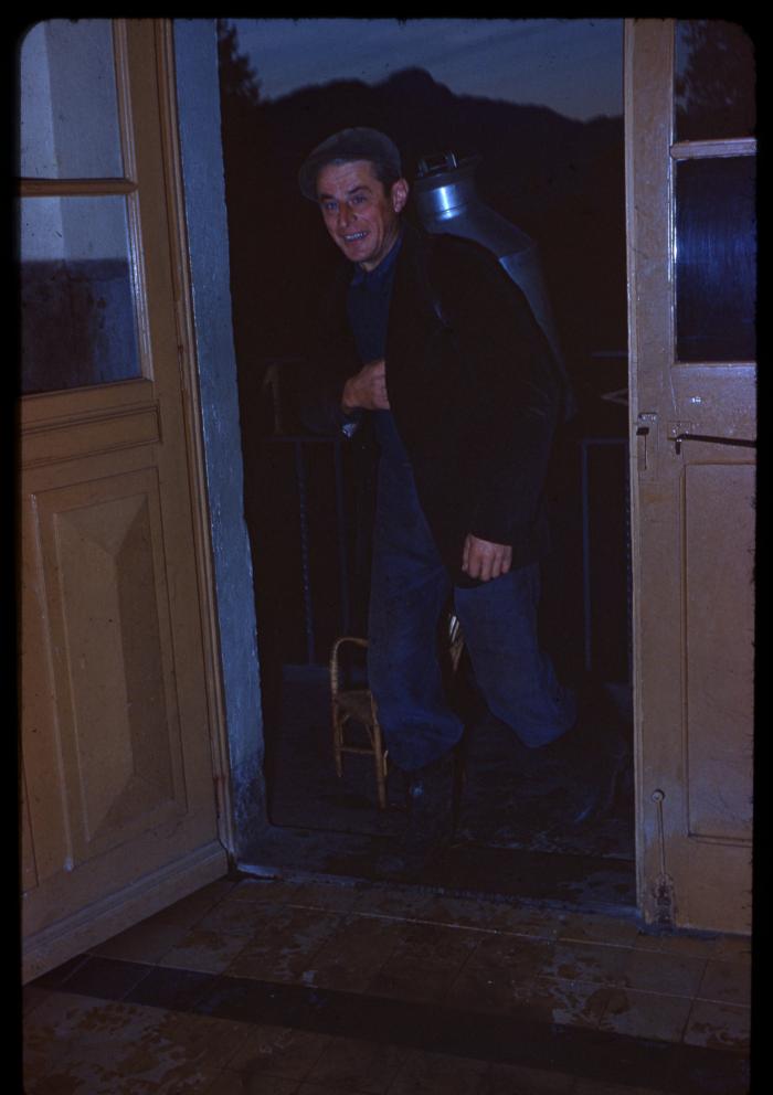 Photographie en couleur représentant le dépôt de lait à la fruitière de Viuz-en-Sallaz par les sociétaires.(Albert Freyre)