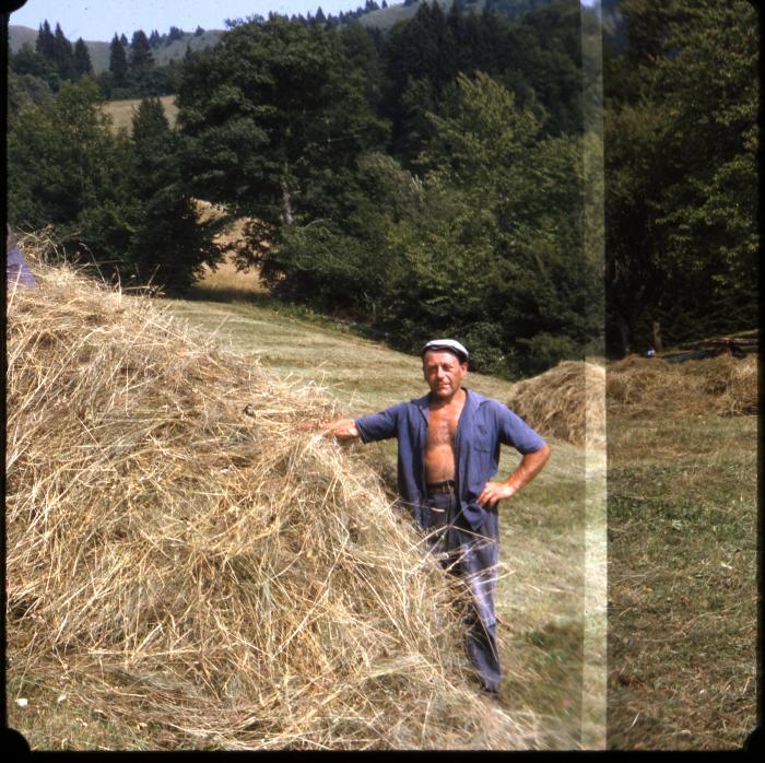 Une personne est debout proche d?un tas de foin.