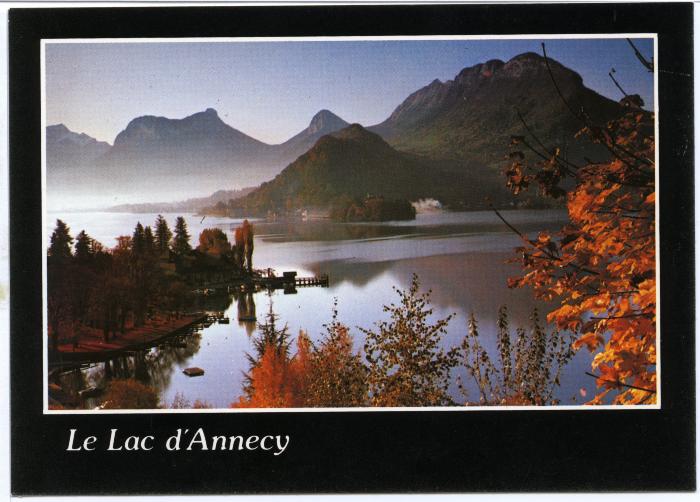 Cette carte est une vue automnale partielle du Lac d'Annecy depuis la baie de Talloires. Talloires se situe sur la rive Est du Lac d'Annecy, à 447 mètres d'altitude, à 13 km d'Annecy, au pied des Dents de Lanfon (1 824 m) et de la Tournette (2 351 m) point culminant du massif entourant le lac.