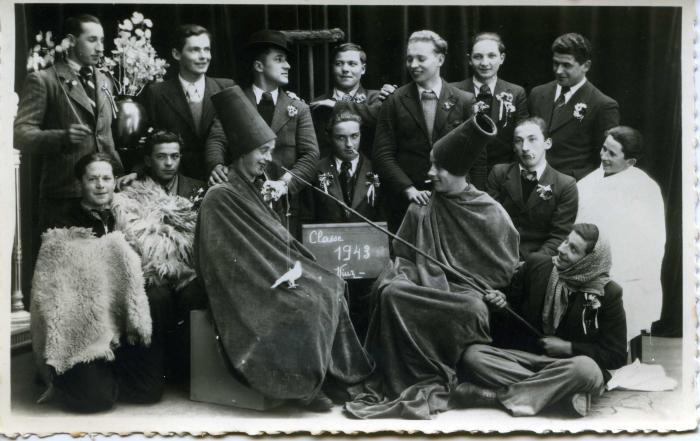 Groupe de conscrits de Viuz-en-Sallaz, de la classe de 1943. Certains sont déguisés. sur la rangée du haut, le deuxième personne en partant de la gauche est René GIRARD. On reconnaît également Edgard ROSAY ( l'homme à la cigarette).