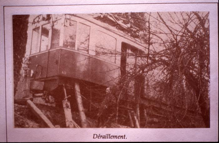Vue du CEN déraillé, sur le bord de la chaussée.