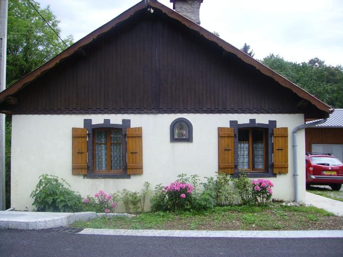 Photographie en couleurs représentant une maison privée dans le village de Bellevaux. Il s'agit d'une maison qui possède un oratoire dans la façade. C'est une niche à l'intérieur de laquelle se trouve trois statuettes et un pot de fleurs.