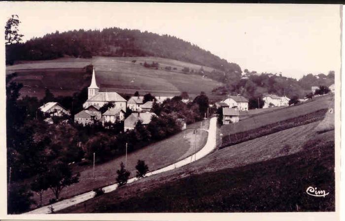 Carte postale, en noir et blanc, représentant la commune de Bogève. On y aperçoit son chef-lieu groupé autour de l'église ainsi que les champs aux alentours depuis la route qui y mène.