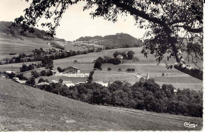 Carte postale, en noir et blanc, représentant la commune de Bogève en été. Il s'agit d'une vue prise derrière les buissons qui ne laissent voir que le clocher du chef-lieu.