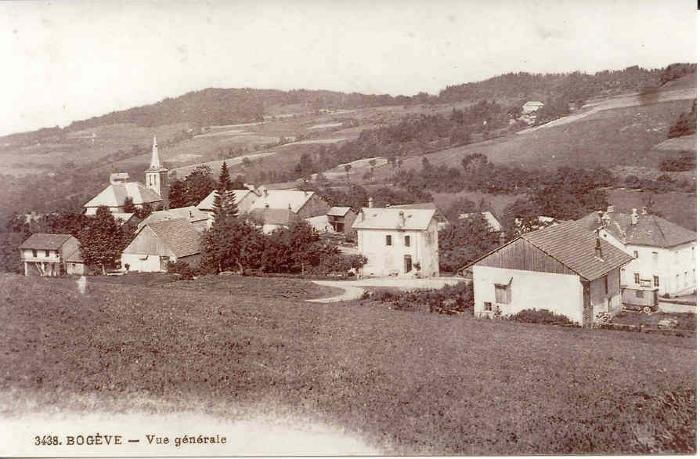 Carte postale, en sépia, représentant la commune de Bogève en été. Il s'agit d'une vue prise derrière le chef-lieu qu'on aperçoit groupé autour du clocher du village.