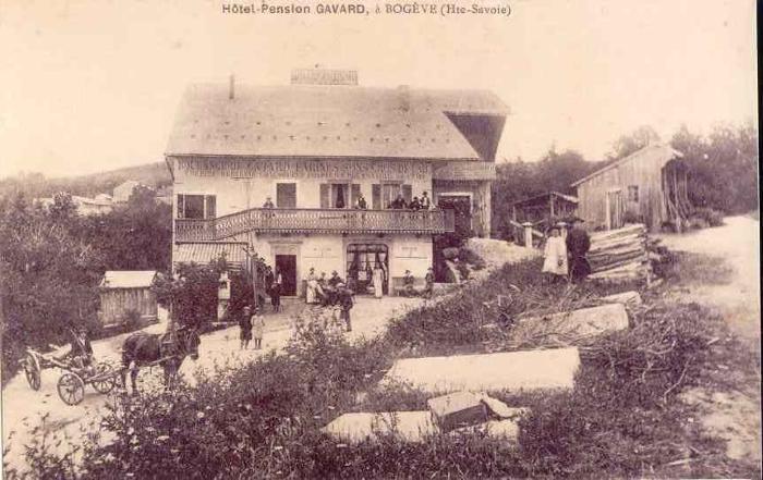 Carte postale, en couleurs, représentant le bâtiment de l'Hôtel Pension Gavard sur la commune de Bogève.