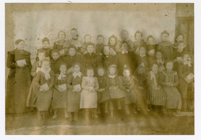 Photographie, en sépia, représentant la classe de 1901 à Bogève. Cette photographie a été prise dans l'école de filles de Mme CLOPPET au mois de Janvier.