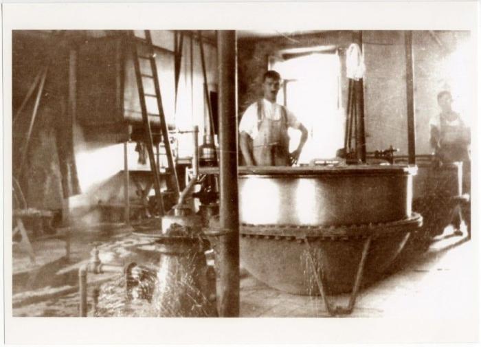 Photographie, en noir et blanc, représentant un homme à côté de la cuve de la fruitière de Bogève. Il s'agit de Fritz WALTI dans les années 1950-1960.