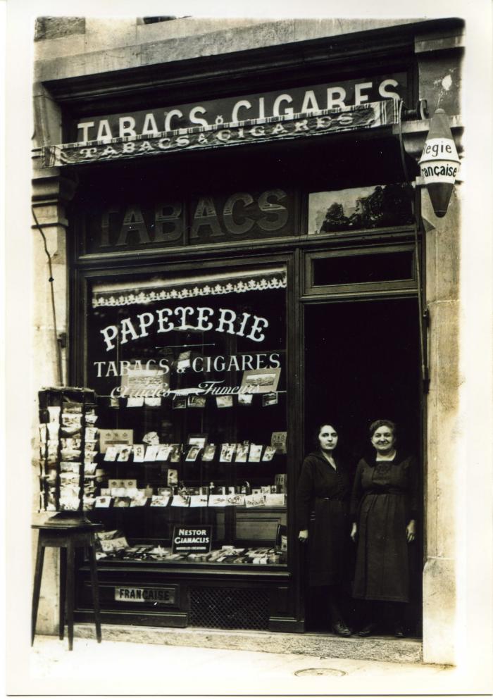 Photographie en noir et blanc de Juliette et Marie Augustine VERDAN (née PINGET MUSY) à Genève, place des Eaux-Vives, devant leur boutique vendant tabacs, cigares et autres articles pour fumeurs, des cartes postales et de la papeterie.