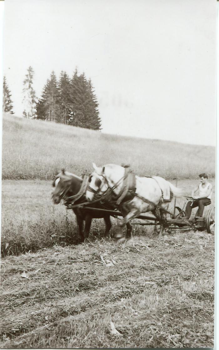 Photographie en noir et blanc de Rémy FOREL au champ en 1950. Il est installé sur une faucheuse attelée à deux chevaux.
