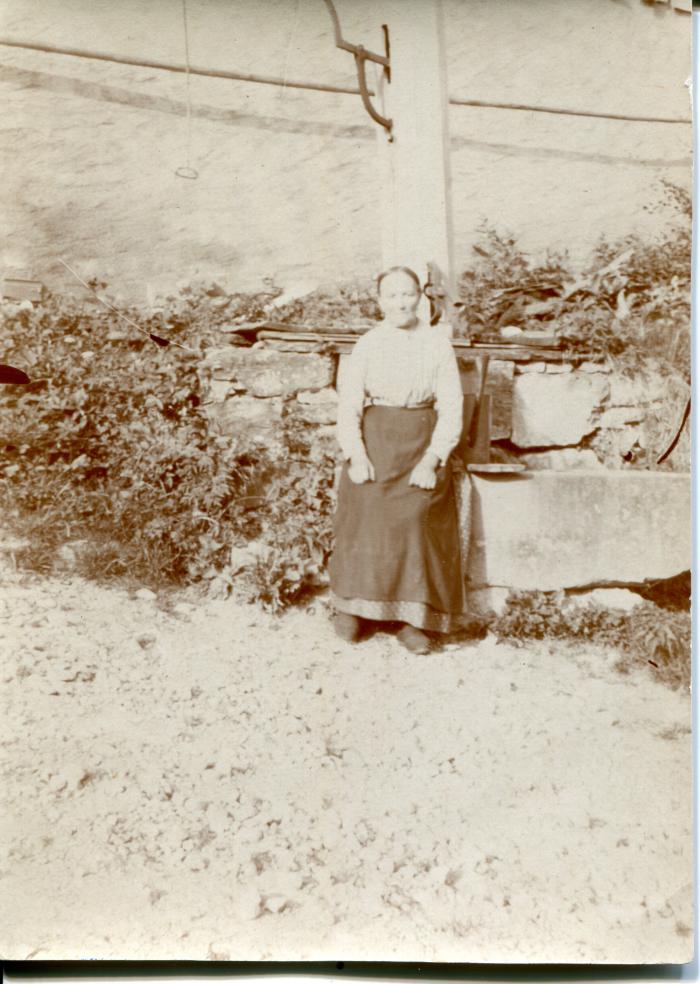 Portrait en noir et blanc d'une femme de Bogève, assise contre un muret de pierre et portant un tablier.