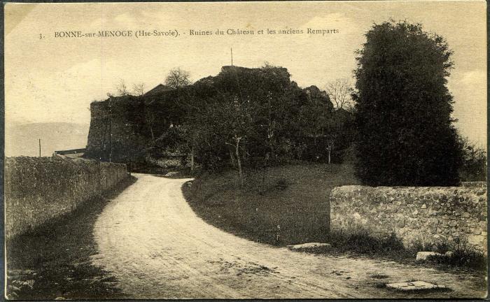 Carte postale en noir et blanc représentant l'accès au château en ruines de Bonne. De part et d'autre, on remarque les anciens remparts de la ville.