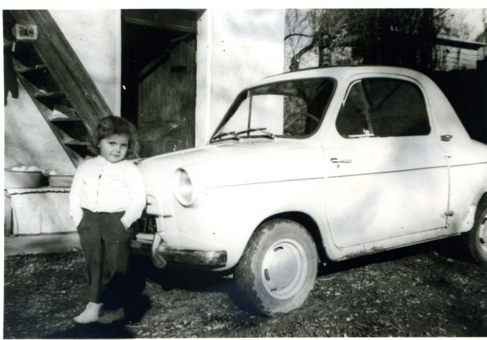 Photographie en noir et blanc représentant une fillette contre une voiture devant une ferme à Faucigny,