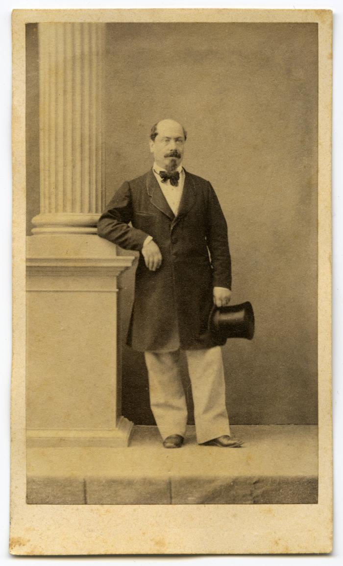 Photographie d'un homme accoudé à une colonne et qui tient un chapeau haut-de-forme dans la main gauche.