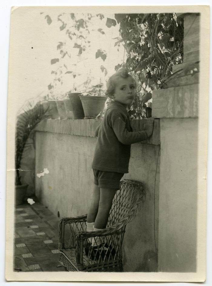 Portrait d'un enfant, sans doute Albert Fouilloux, debout sur un petit fauteuil en osier, sur une terrasse, un balcon, ou dans une cour, en octobre 1920. Albert Fouilloux, neveu du docteur Adrien Bonnefoy et de sa femme Augusta (née Fouilloux).
