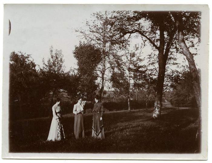 Photographie de trois jeunes femmes dans le parc Chez Bosson à Fillinges. Celle à gauche et celle à droite pourraient être Louise et Julie Bonnefoy, sœurs du docteur Adrien Bonnefoy.