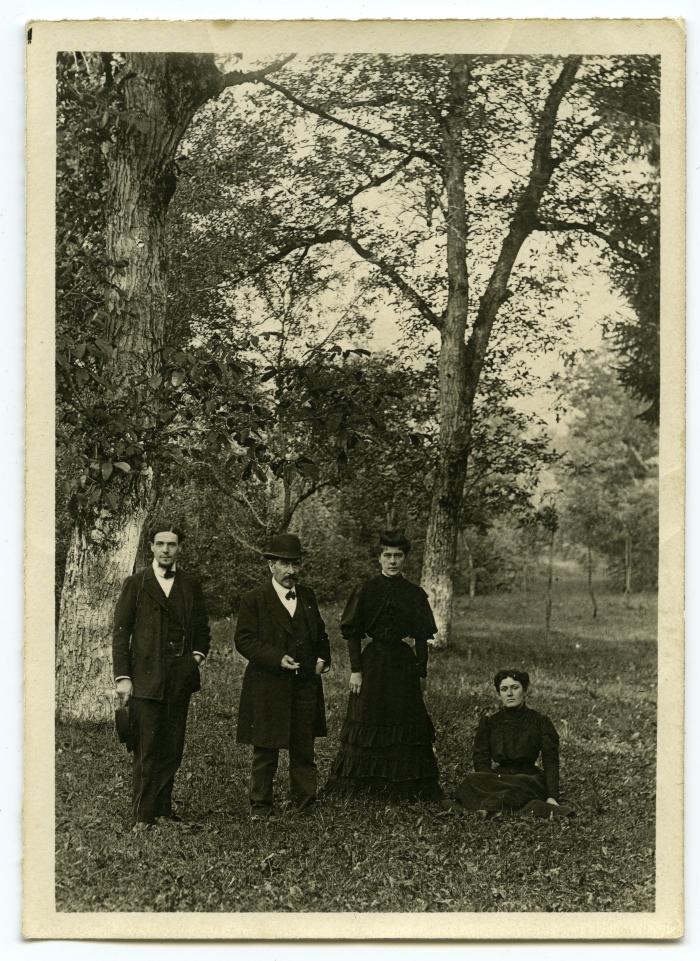 Photographie de quatre personnes vêtues de sombre dans un parc, sans doute Chez Bosson à Fillinges. A gauche, le docteur Adrien Bonnefoy.
