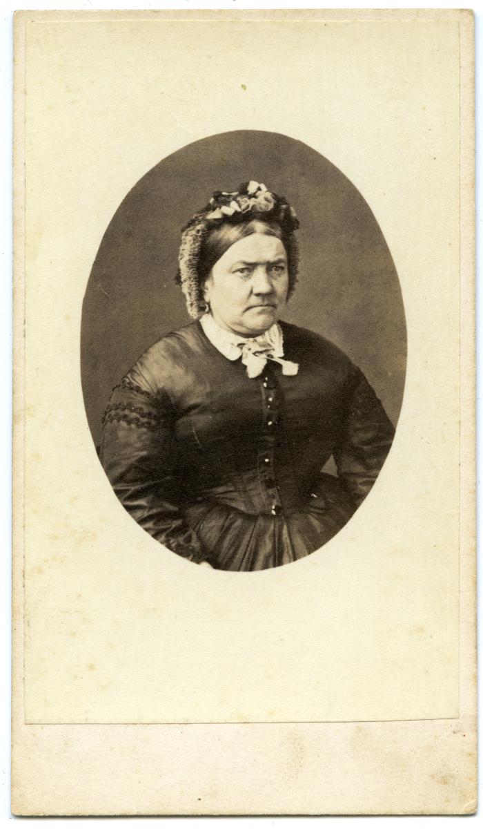 Portrait d'une femme coiffée d'un chapeau et portant une robe à crinoline. Il s'agit peut-être d'une proche de la famille du docteur Adrien Bonnefoy (il habitait Chez Bosson à Fillinges).