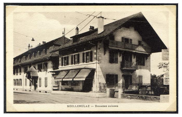 Carte postale en noir et blanc représentant le bâtiment de Douane de Moillesulaz.