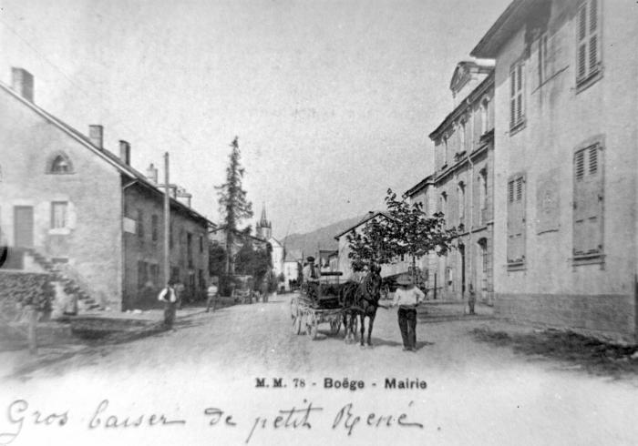 Carte postale offrant une vue de la mairie de Boëge, sa rue et des habitants avec un cheval. Travail de documentation réalisé par le GAER, Groupe d'Action pour l'Environnement Rural, la qualité de vie, l'animation à Habère-Poche.